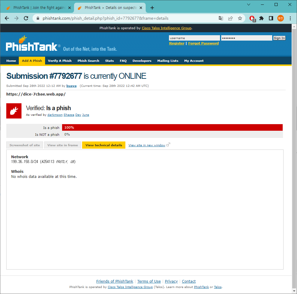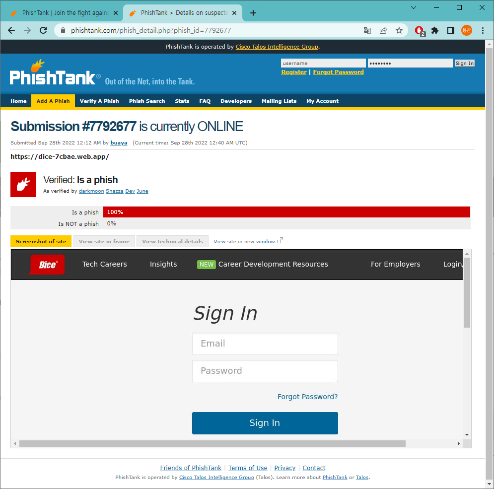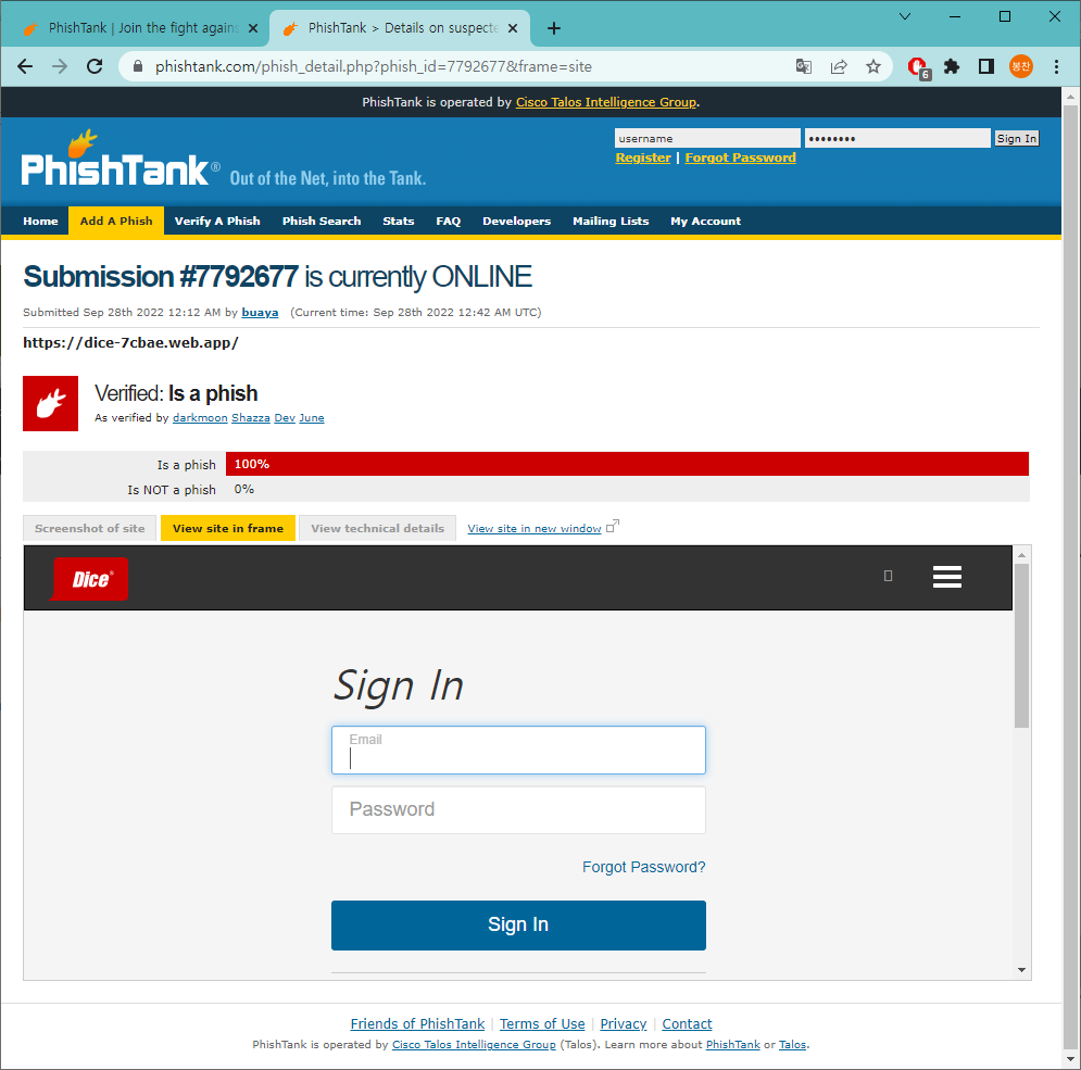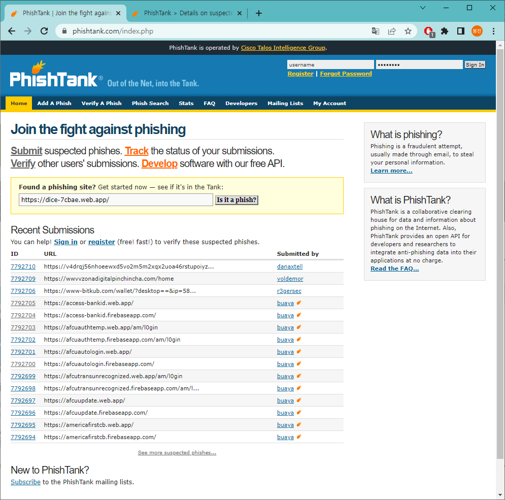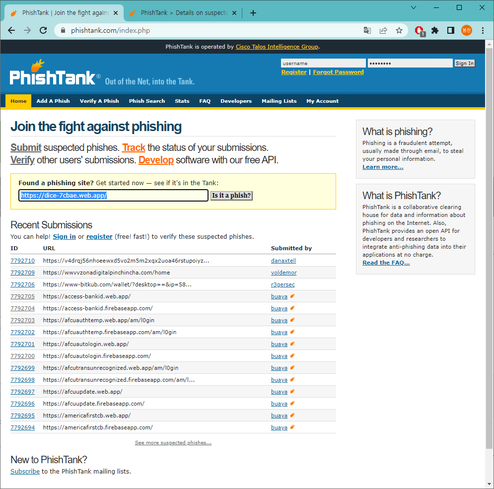 그래서 찾아 보니 외국에서 PhshTank 라는 사이트에서 피싱 여부를 확인 해 주네요.